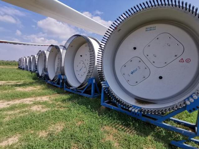 這些卡車上拉著的很大、很長、像飛機(jī)翅膀一樣的龐然大物就是風(fēng)力發(fā)電機(jī)的葉輪,就是我們所說的葉片??傞L度60多米,二十多噸重。